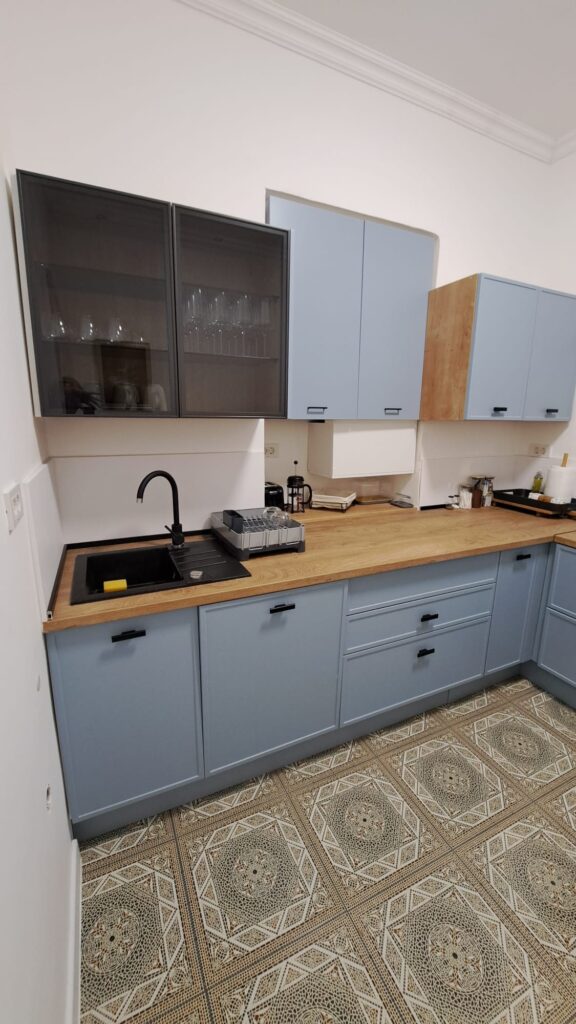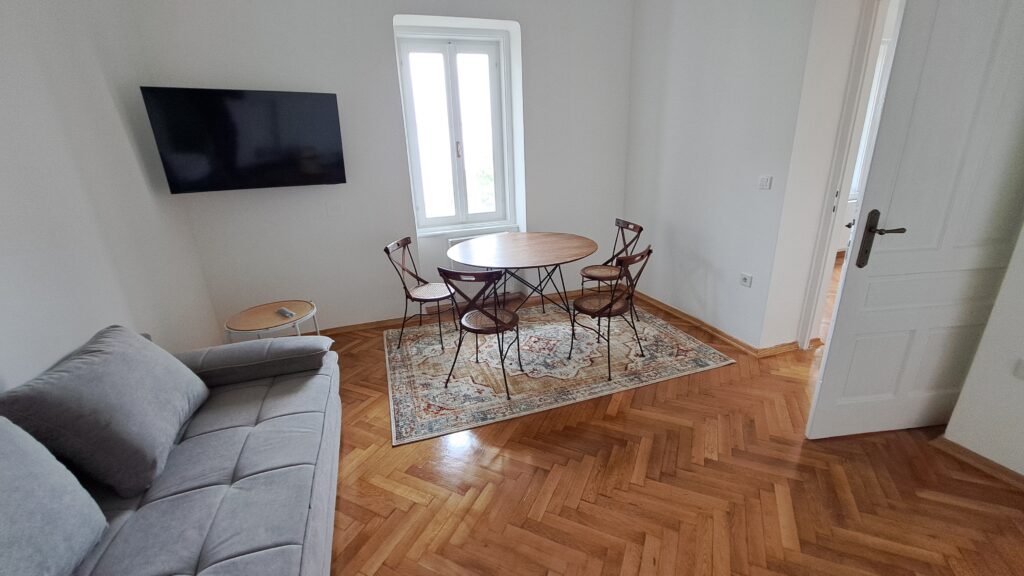 Im 1868 fertig gestellten Wohnhaus befinden sich drei Wohnungen auf drei Etagen. Die drei Eigentümer vermieten die Wohnungen an Reisende und nutzen gemeinsam den naturbelassenen Garten mitten in der Stadt.  Die Nachbarschaft heißt Pećine, was übersetzt „Höhlen“ heißt. Die Gegend fußt überwiegend auf Felsen aus Kalkstein, die für ihren zerklüfteten Untergrund bekannt sind und eindrucksvolle Höhlenkomplexe gebildet haben. Das absolute Zentrum Rijekas ist 2km oder 20 Minuten Fußweg entfernt. Zum Strand sind es etwa 150 Treppenstufen, Luftlinie gute 200m. Rijekas größte Shopping-Mall, das Tower-Center, ist gerade mal 50m entfernt.