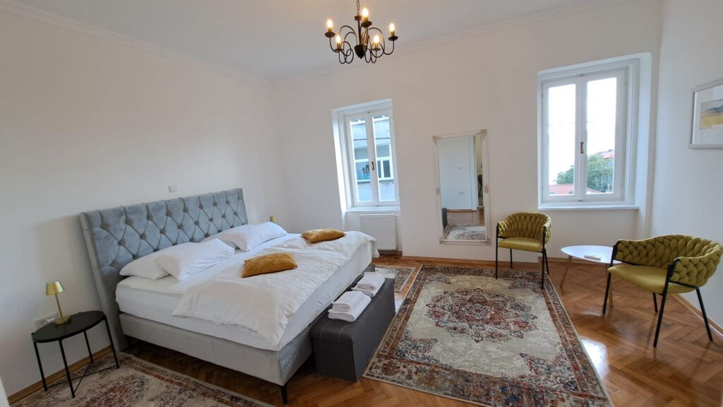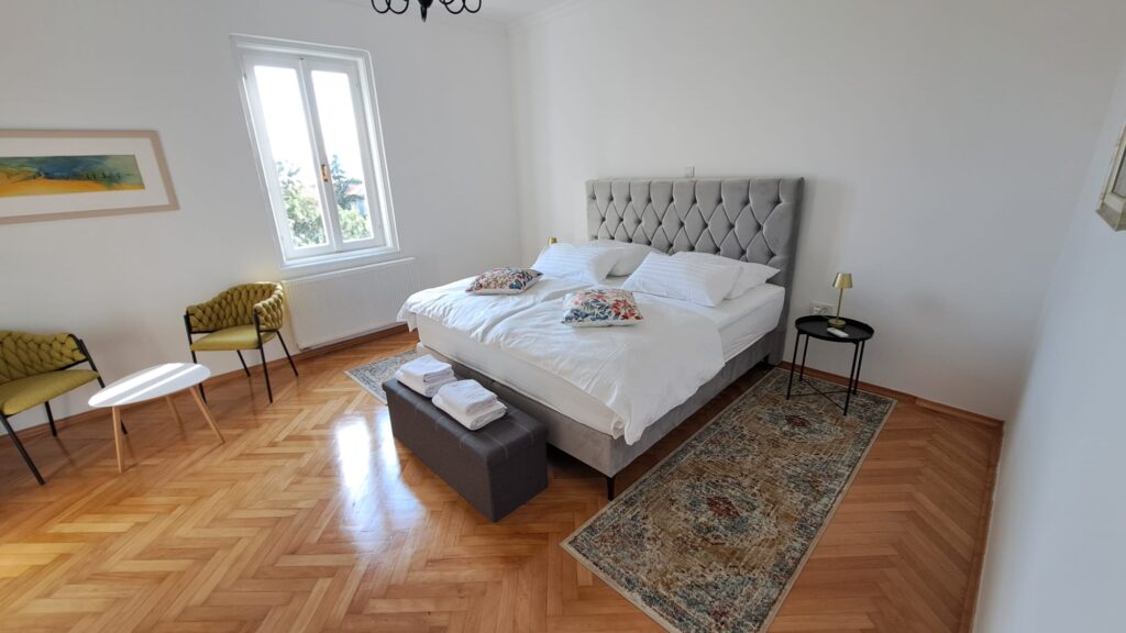 Im ersten OG befindet sich Ulika, unsere kürzlich vollständig renovierte Ferienwohnung. Obwohl so ziemlich alles neu gemacht wurde, haben wir Wert gelegt auf alten Charme. Die hohen Decken und die neu aufgearbeiteten Echtholzböden geben Ihnen das Gefühl, in einer Zeit um 1900 zu sein. Trotzdem genießen Sie den Komfort einer Etagenheizung in komplett klimatisierten Räumen. Alle drei Zimmer, also zwei Schlafzimmer und das Wohnzimmer, bieten einen fantastischen Meerblick auf die ganze Kvarner-Bucht. Eine kleine Lesenische bietet Platz für beschauliche Momente mit einem guten Buch und einem hoffentlich ebenso guten Glas Wein. Seitlich am Haus ist ein natürlich beschatteter Garten mit Gasgrill, Sitzgarnitur und einigen Liegen, der dieser Wohnung zur Verfügung steht.